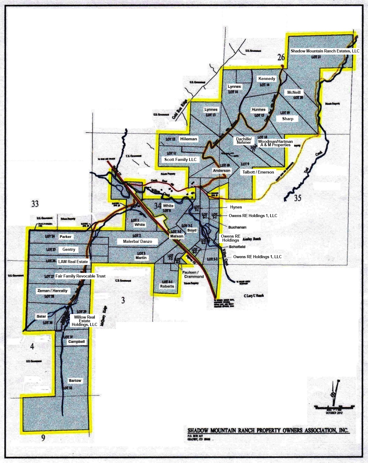Owners in SMR-POA: This map shows owners of each lot included in Shadow Mountain Ranch Property Owners Association. Download this map from the sidebar or click the image or following link to view the map in a new window.